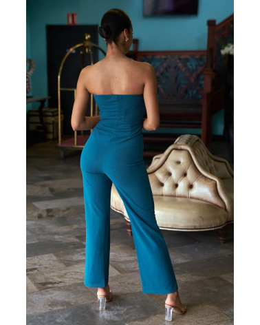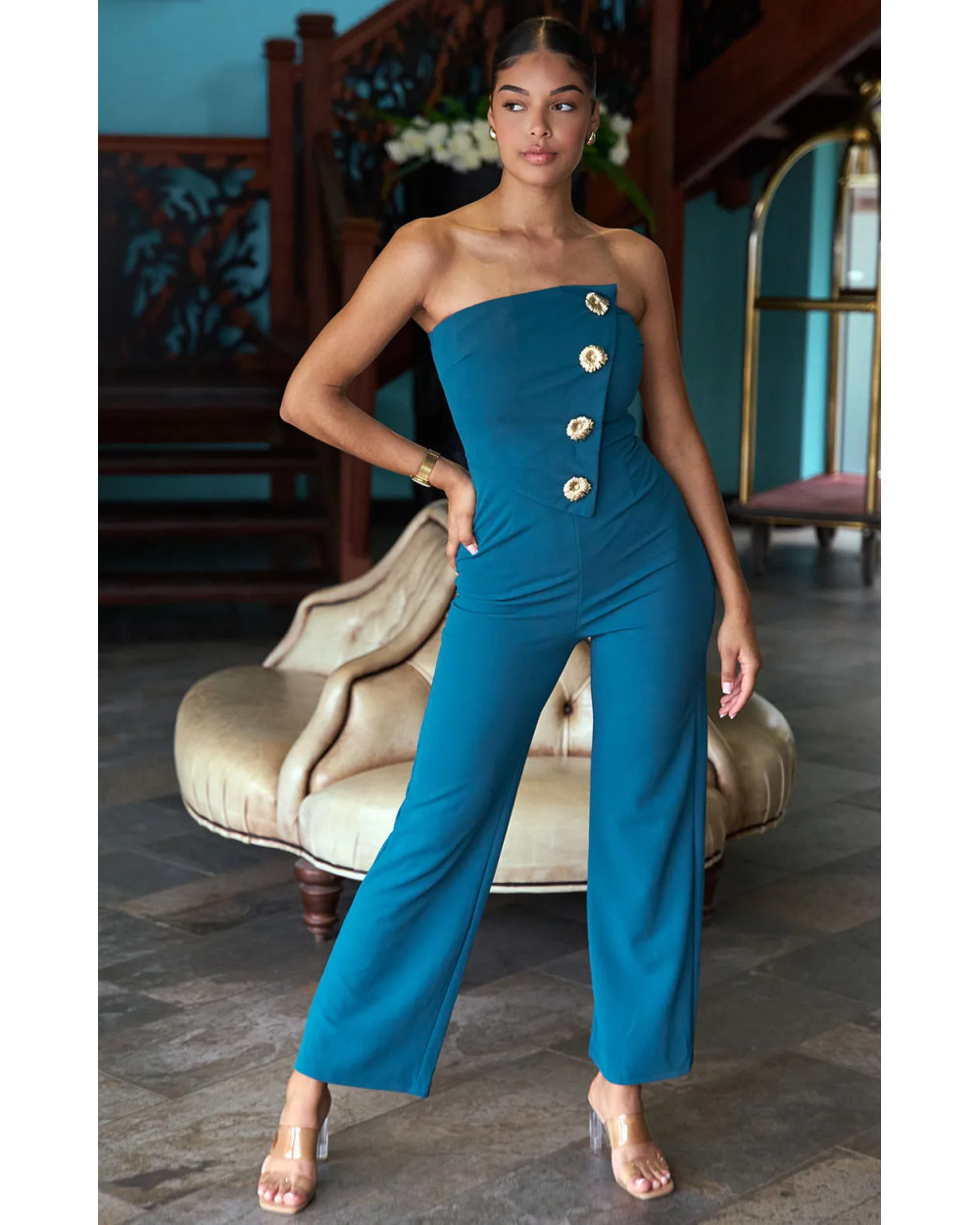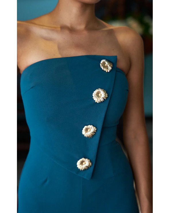 Élégante et originale, cette combinaison pantalon bustier est sublimée par des détails dorés façon bijoux sur le devant. Sa version bleu canard assure un style chic et facile à porter.