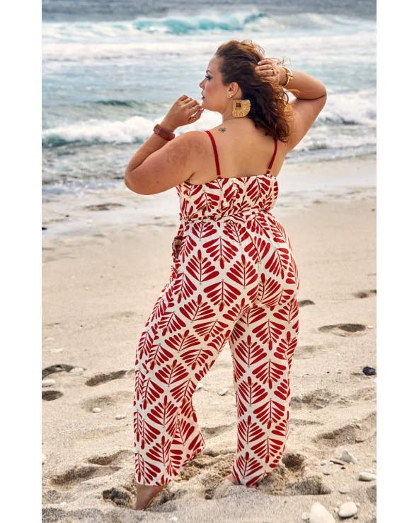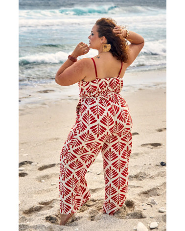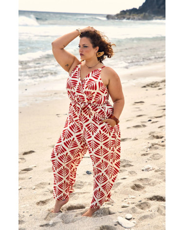 Cette combinaison féminine allie confort et style : le décolleté croisé et la ceinture à la taille structurent la coupe, tandis que les motifs feuilles apportent un détail subtil et raffiné. Ce vêtement se combine parfaitement avec la version fillette, pour un duo mère-fille tendance et élégant.