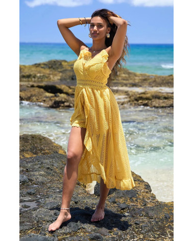Craquez pour l élégance estivale de cette combi-short avec ses volants sur le haut, son effet robe et ses détails en crochet, parfaite pour un look chic et léger !