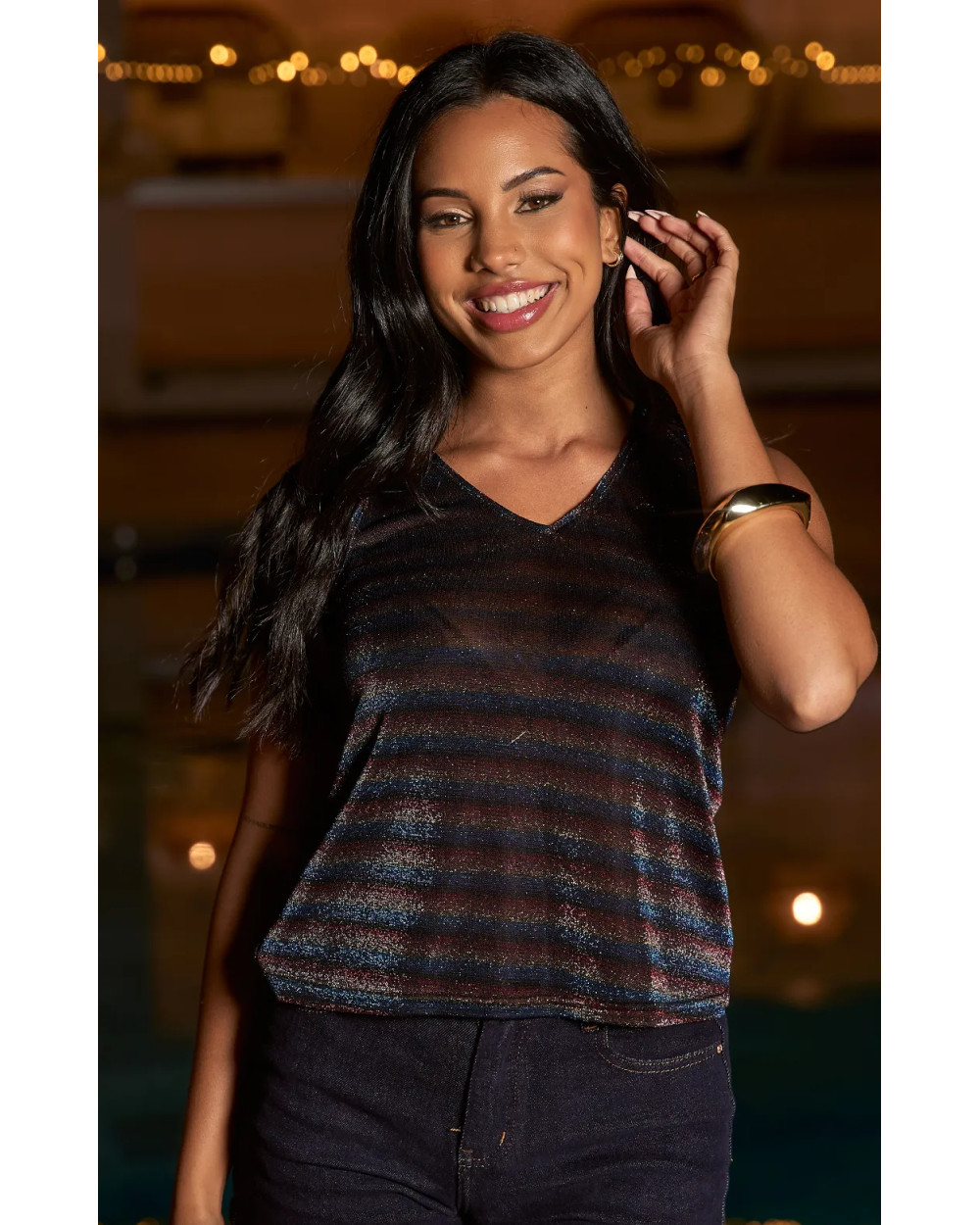 Un débardeur fluide aux rayures scintillantes, proposé en noir ou bleu pour un style chic et tendance. Son décolleté légèrement en V apporte une note féminine, parfaite pour briller en journée comme en soirée.