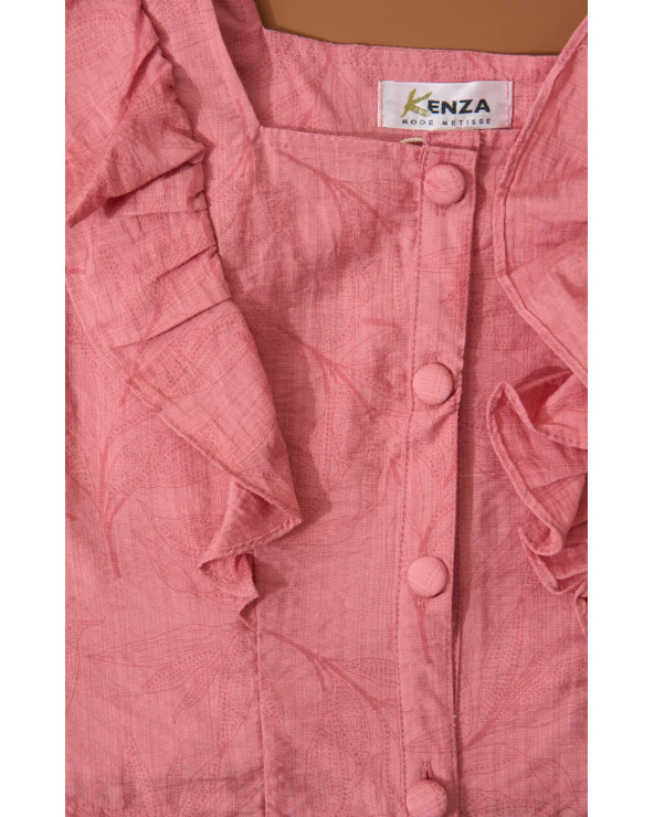 Apportez fraîcheur et style à votre look avec l ensemble Rose Bonbon. Le T-shirt crop top style lin se distingue par ses boutons sur le devant et ses délicats froufrous sur les côtés, ajoutant une touche féminine et originale. Le short jupe style cargo, avec sa ceinture à nouer à la taille, combine confort et style tout en soulignant la silhouette.
