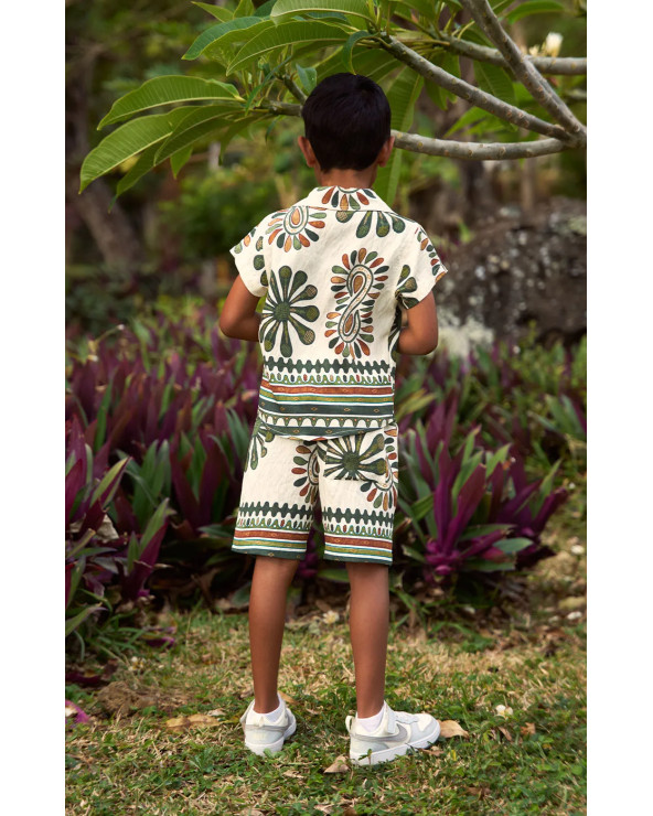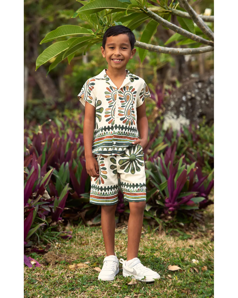 Adorable ensemble pour garçon comprenant une chemise à manches courtes ornée de motifs inspirés du style mexicain, dans des tons beige et kaki et d un short avec les mêmes motifs. Confortable et léger, parfait pour un look tendance au quotidien. Existe également pour homme.