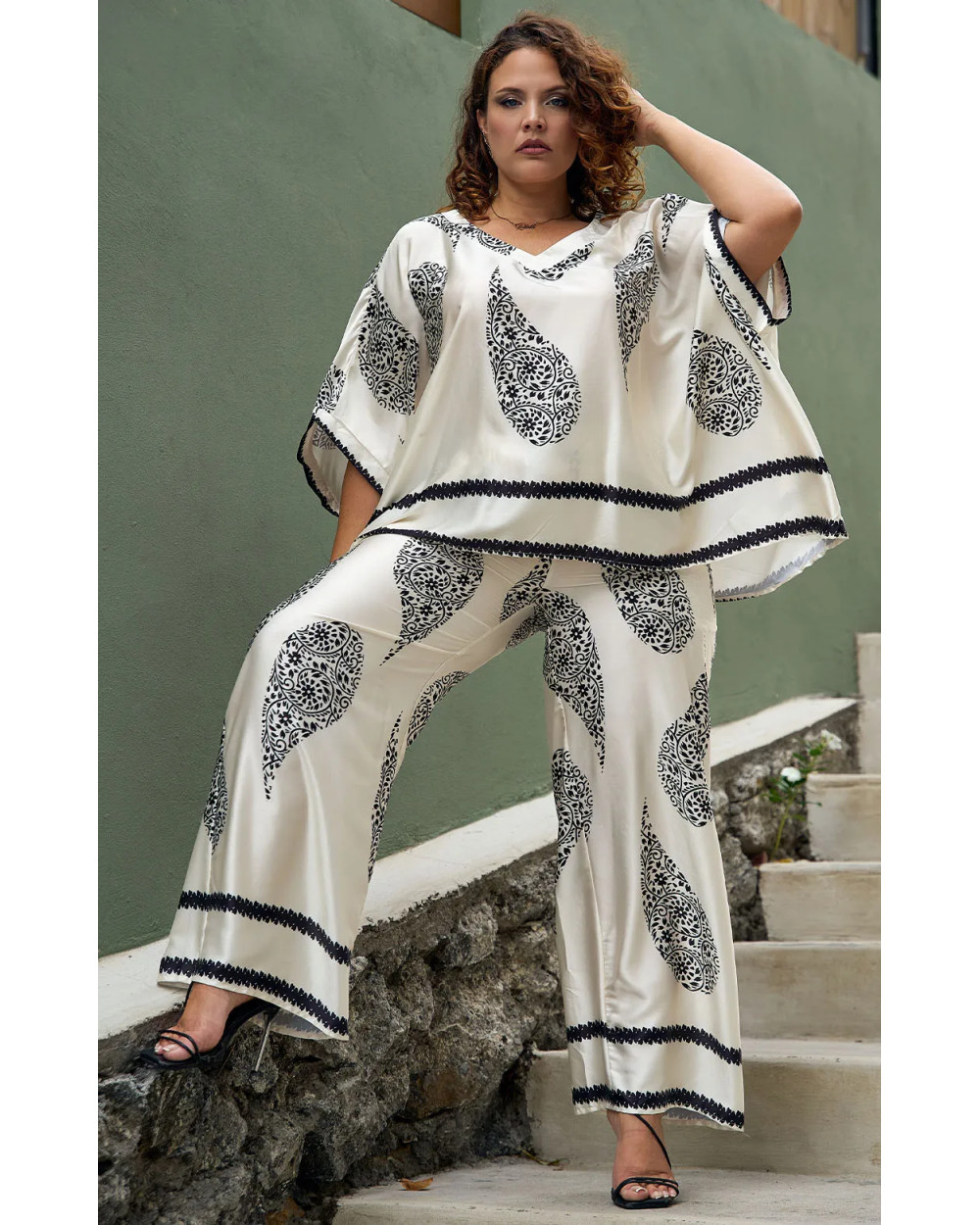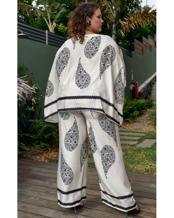 Découvrez notre ensemble pantalon cashmir, alliant élégance et confort grâce à sa matière fluide et douce. Ses motifs graphiques apportent une touche sophistiquée à votre look. Disponible en 4 coloris.