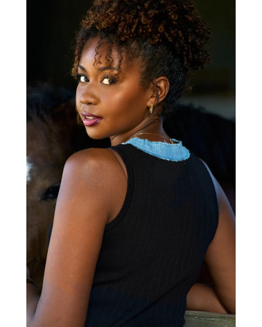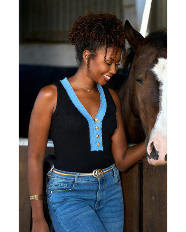 Optez pour ce débardeur en maille denim, à la fois tendance et confortable. Son col en V est mis en valeur par une bande de couleur et des boutons décoratifs, pour un détail raffiné et original. Facile à assortir avec un jean ou un short, il est parfait pour un look casual chic en toute saison.