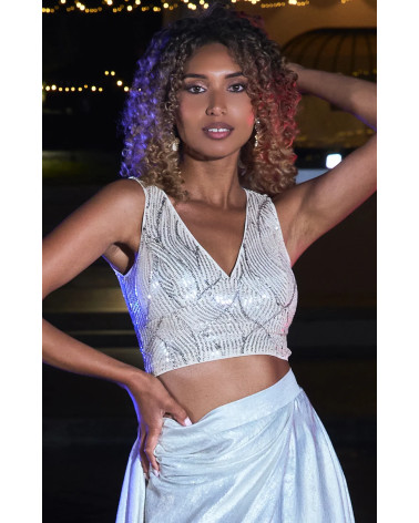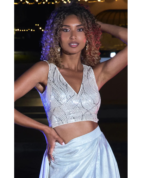Affichez une allure moderne avec ce crop top sequin au décolleté en V et motifs rayés graphiques. Disponible en 4 coloris, il sublime vos tenues avec éclat et style.