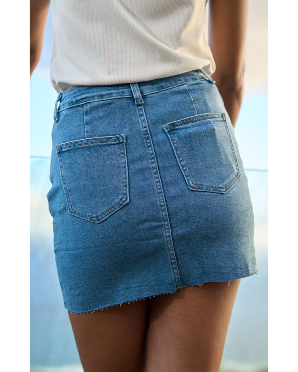 Polyvalente et féminine, cette jupe courte en jean se distingue par ses motifs de nœuds blancs sur le devant et ses poches avant et arrière. Elle est parfaite pour compléter vos looks casual avec style et originalité.