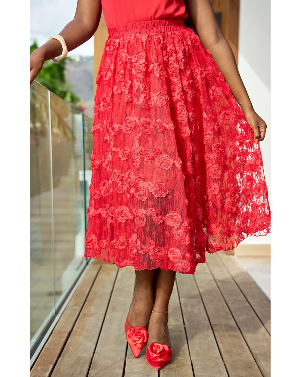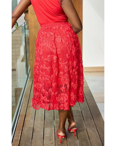 Légère et élégante, cette longue jupe à roses en relief se distingue par son voile supplémentaire qui apporte profondeur et légèreté. Ajustée à la taille, elle s associe facilement à un haut de la collection ou à vos essentiels pour un look raffiné. Disponible en rose, menthe ou rouge.