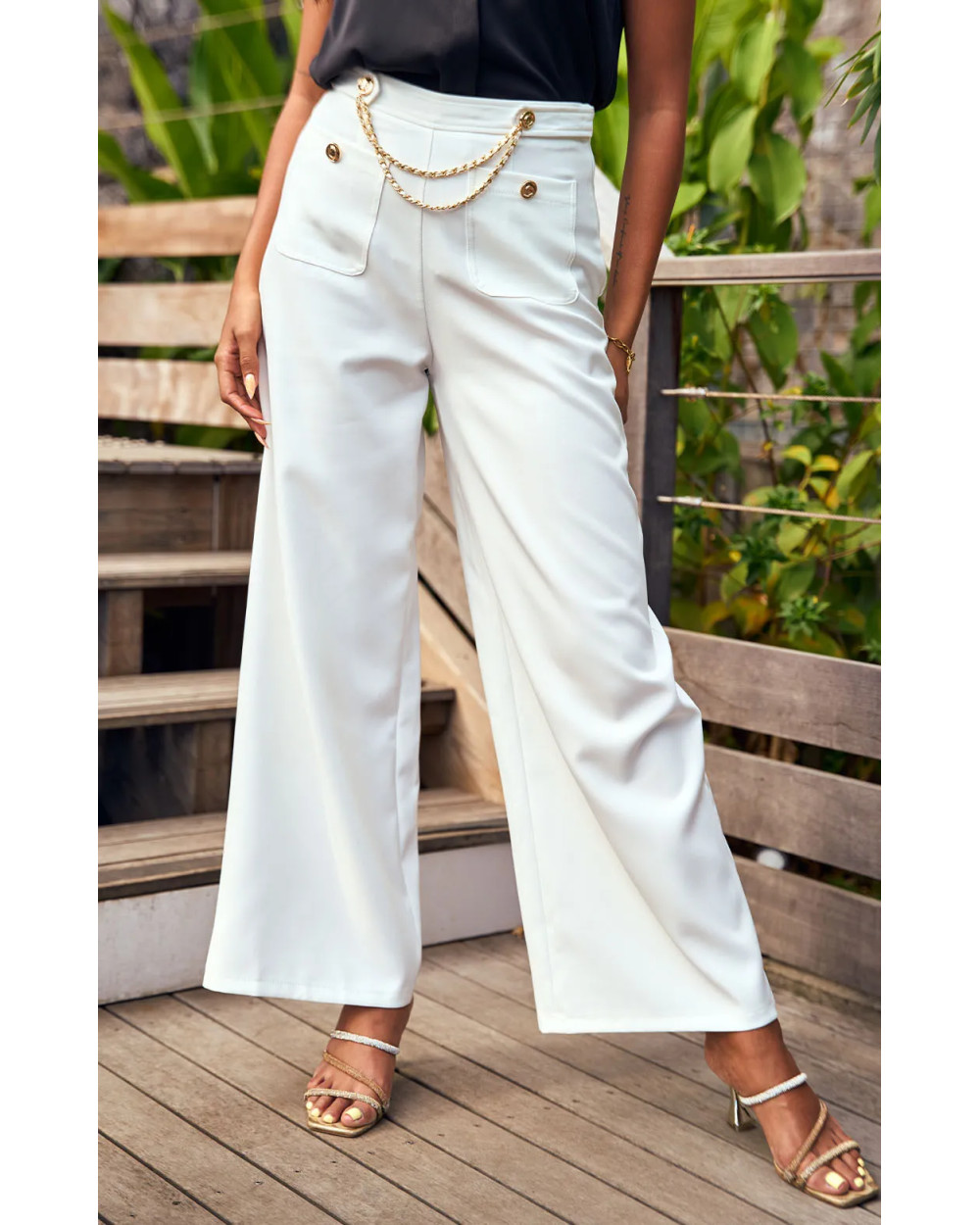 Ce pantalon style tailleur à coupe large allie élégance et modernité. Ses poches ornées de boutons dorés esprit marinière et sa chaînette dorée à la taille apportent une touche chic et raffinée. Idéal pour un look sophistiqué au quotidien ou en soirée.