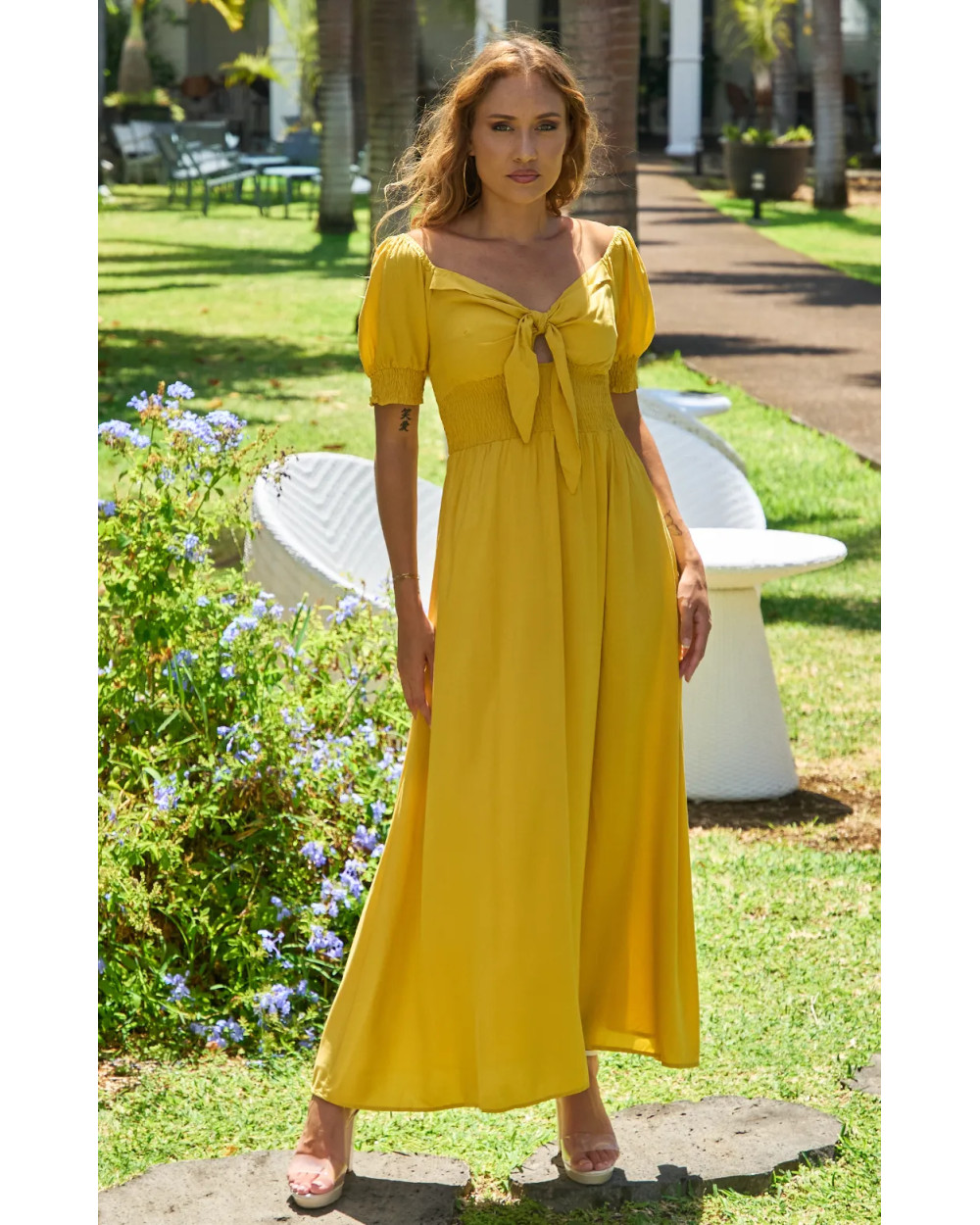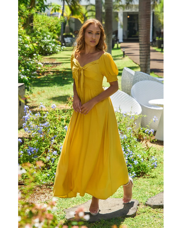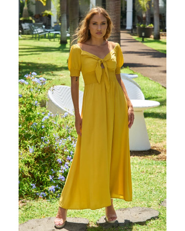 Optez pour l élégance avec cette robe longue fluide, délicatement nouée à la poitrine, parfaite pour une allure sophistiquée et légère !