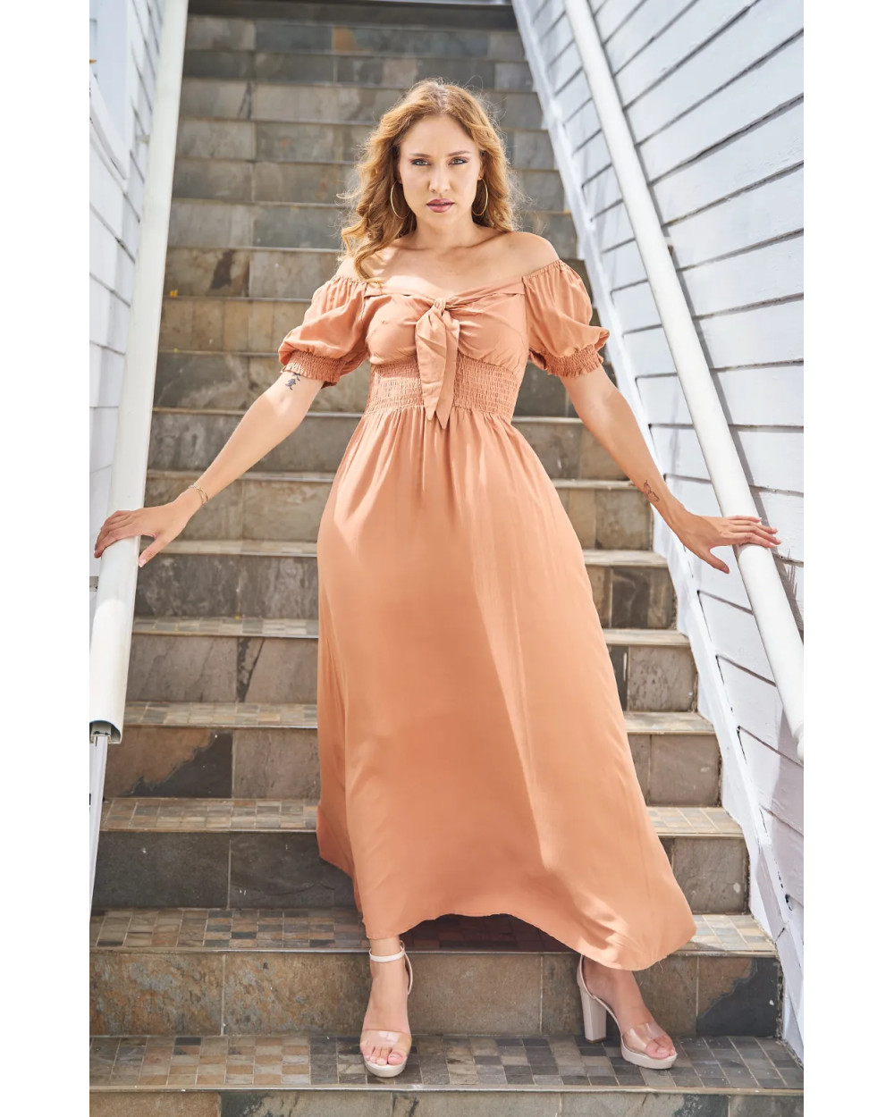Optez pour l élégance avec cette robe longue fluide, délicatement nouée à la poitrine, parfaite pour une allure sophistiquée et légère !