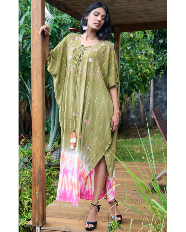 Robe caftan ample et fluide, alliant confort et élégance pour une allure à la fois décontractée et sophistiquée