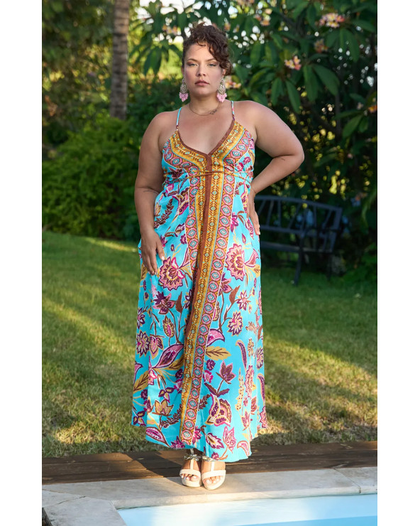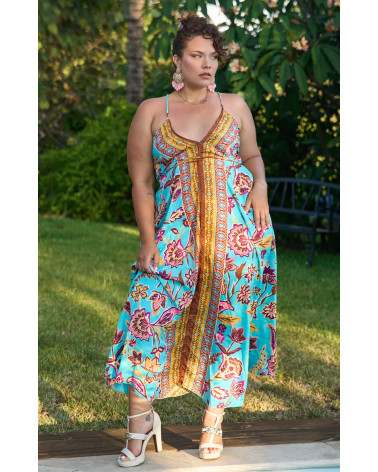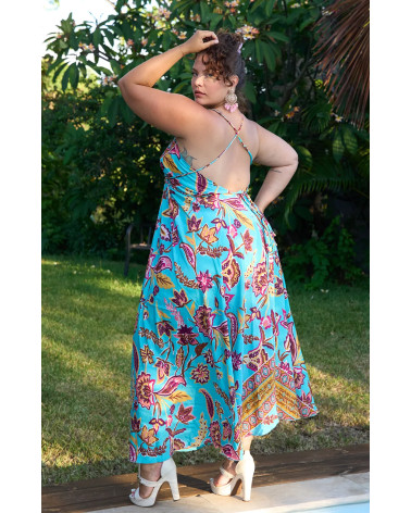 Robe à fines bretelles avec dos nu et imprimé turquoise, une coupe légère et fluide pour une allure estivale chic et envoûtante.