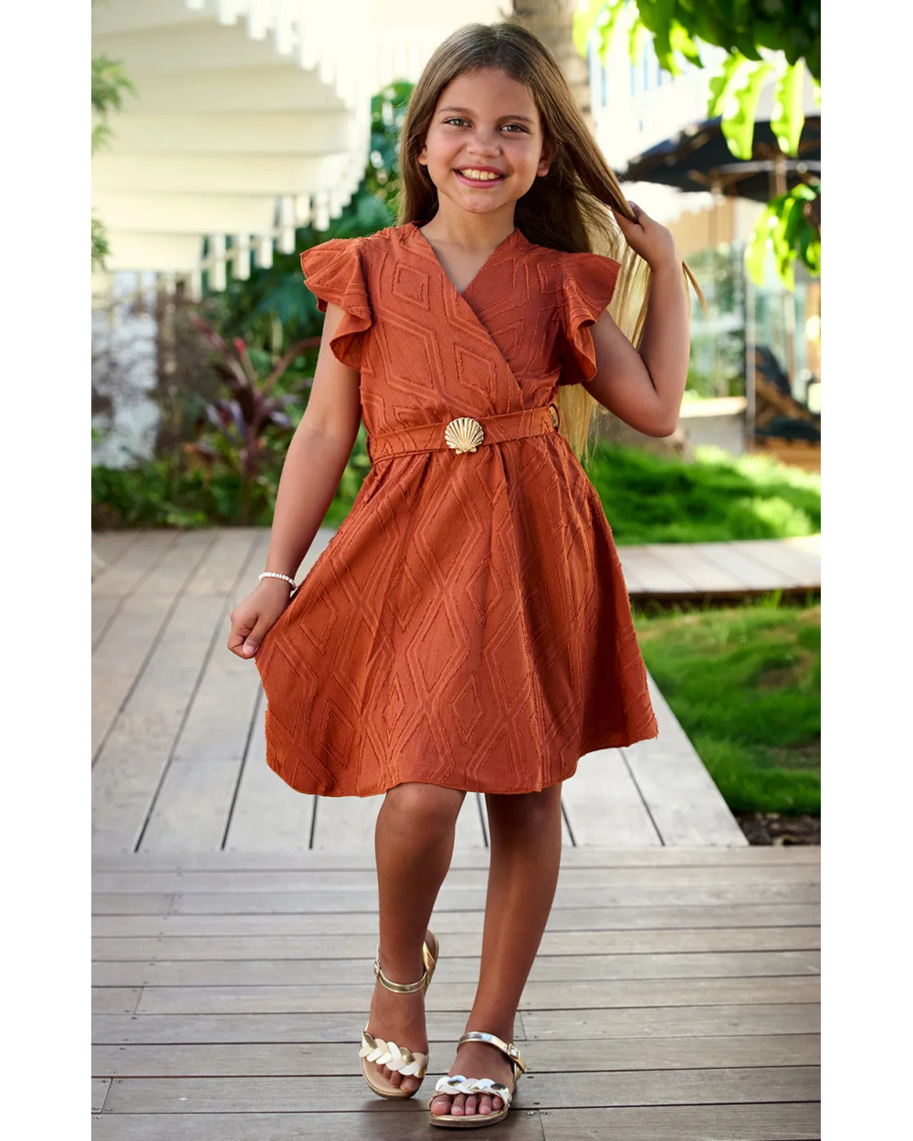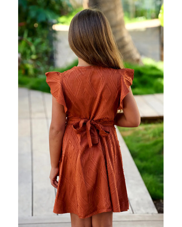 Adorable et légère, la robe complice fille complète parfaitement le look family assorti ! Sa coupe fluide, son col V croisé et sa ceinture à double boucle apportent style et confort. Disponible en bleu ou brique, c’est un incontournable de la mode enfant fille tropicale pour l’été.