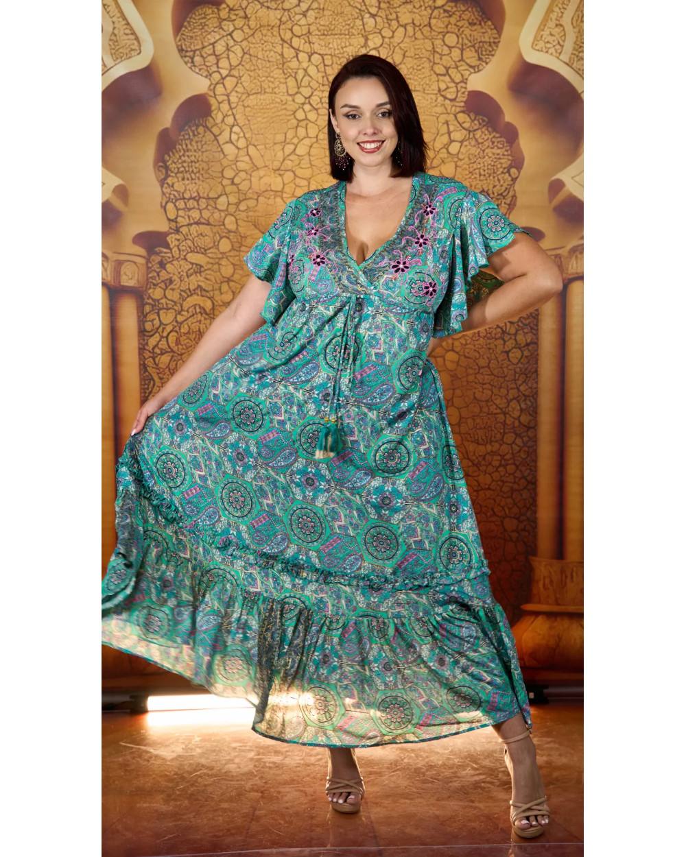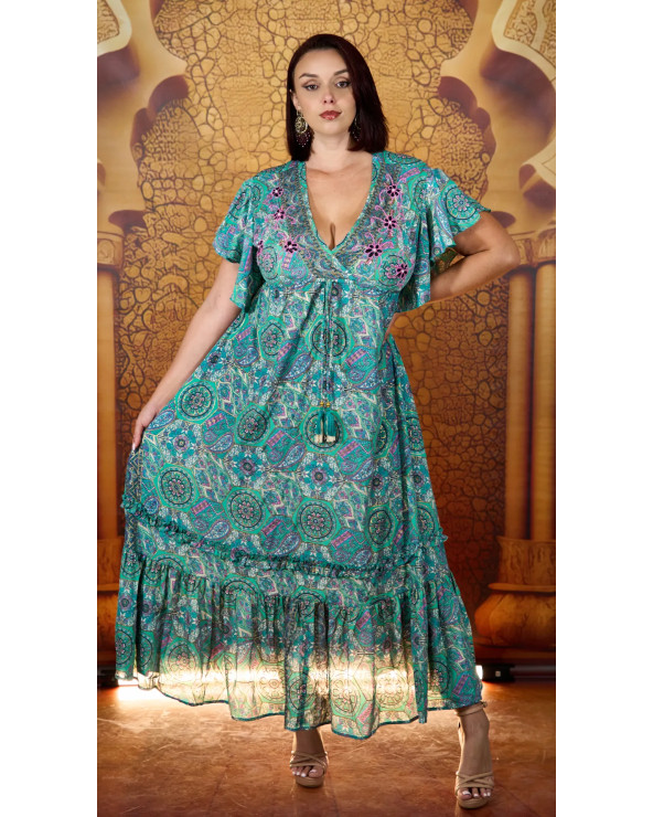 Adoptez un style bohème avec cette robe longue femme col V ornée de motifs mandalas colorés. Ses froufrous délicats sur les manches et en bas apportent une touche romantique et légère. Idéale pour une journée ensoleillée, une sortie chic ou une soirée.