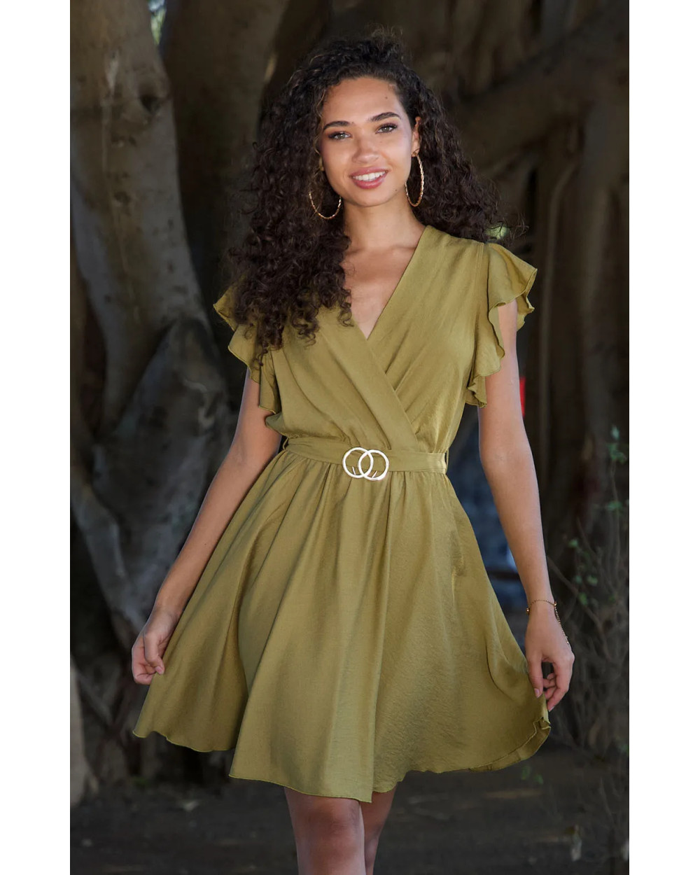 Adoptez un look élégant avec cette robe fluide unie femme, à la coupe cache-coeur qui met en valeur la silhouette. Ses manches à froufrous apportent une touche féminine et délicate. Elle est accompagnée d une ceinture au niveau de la taille, ornée d’un joli détail de deux ronds sur la boucle, pour un effet raffiné et original. Parfaite pour vos journées d’été, vos sorties décontractées ou vos occasions spéciales