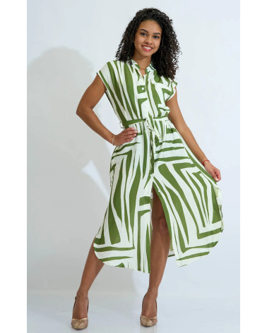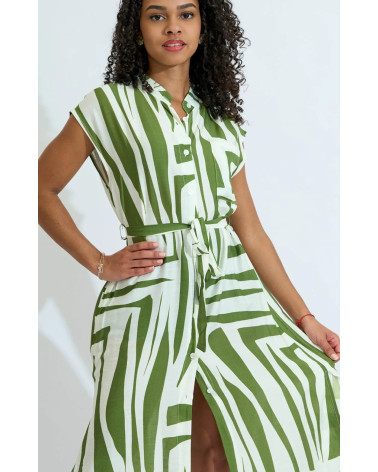 Robe longue style chemise sans manches, avec ceinture à nouer à la taille. Son tissu à motifs graphiques offre un look moderne et original, disponible en vert, noir, marron et bleu. Parfaite pour un look décontracté mais élégant, elle s adapte à toutes les occasions. Un choix parfait pour un style à la fois tendance et confortable.