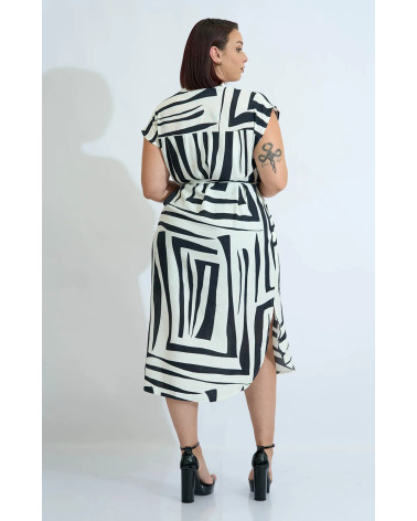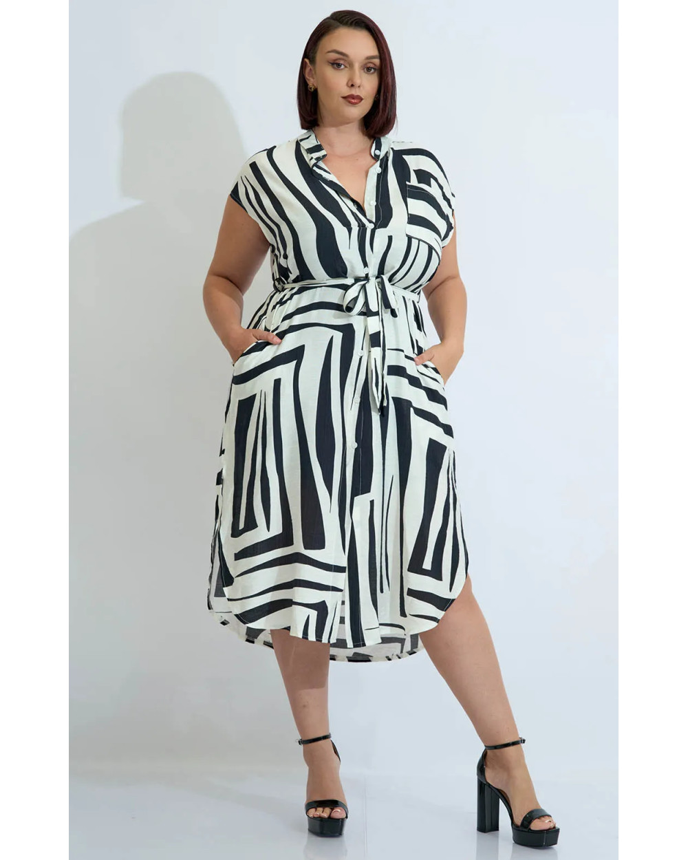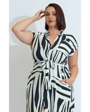 Robe longue style chemise sans manches, avec ceinture à nouer à la taille. Son tissu à motifs graphiques offre un look moderne et original, disponible en vert, noir, marron et bleu. Parfaite pour un look décontracté mais élégant, elle s adapte à toutes les occasions. Un choix parfait pour un style à la fois tendance et confortable.