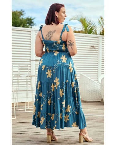 Succombez à l élégance de cette robe longue, sublimée par de délicats motifs floraux dorés. Les bretelles sont ornées de nœuds ajustables sur chaque épaule, ajoutant une touche féminine et personnalisable à la tenue. Parfaite pour un look chic et raffiné, cette robe est idéale pour les occasions spéciales ou les journées ensoleillées où l on souhaite allier confort et style.