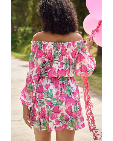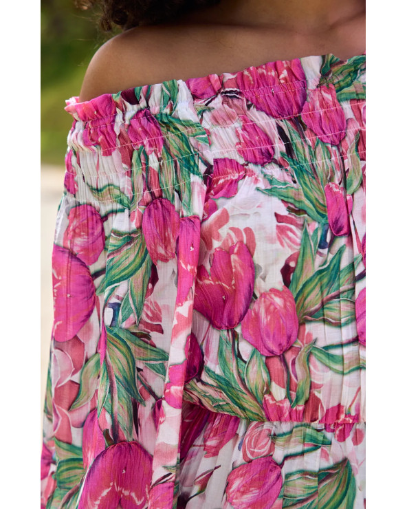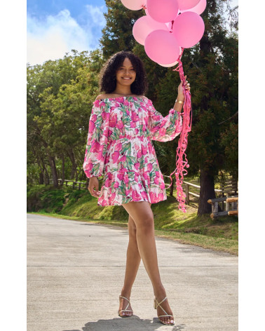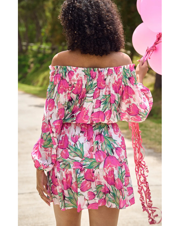 Cette robe allie élégance et féminité avec ses manches longues et ses épaules délicatement dénudées. Le cintrage à la taille souligne la silhouette, tandis que les motifs floraux apportent une touche fraîche. Parfaite pour une sortie chic ou un événement, elle assure confort et style en toute occasion.