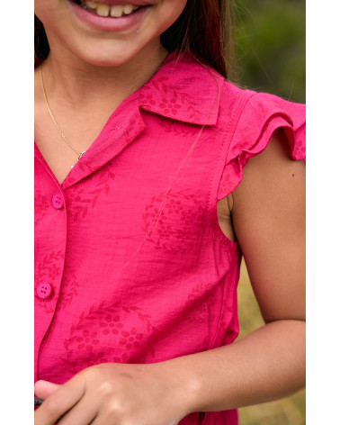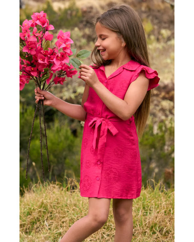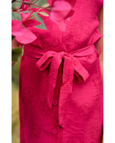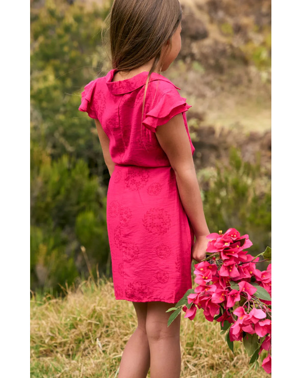 Légère et charmante, cette robe courte fuchsia se distingue par ses motifs fleuris subtils, son col type chemise et sa ceinture à la taille. Les volants sur les épaules ajoutent une touche délicate à chaque mouvement.