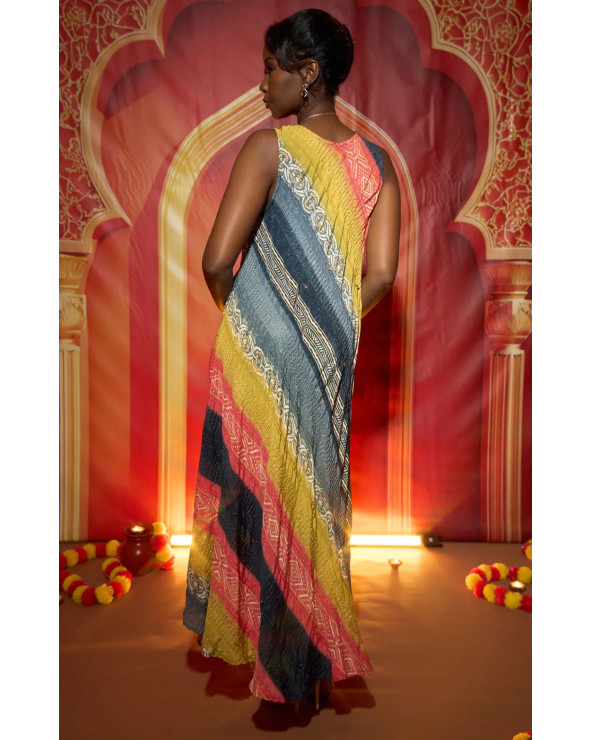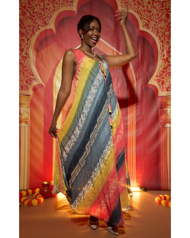 Robe longue ample à décolleté rond, décorée d un petit nœud et de pompons au centre, avec motifs graphiques et dégradés de couleurs. Disponible en 4 teintes éclatantes.