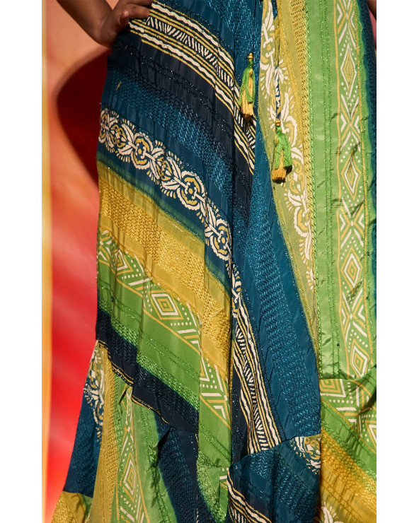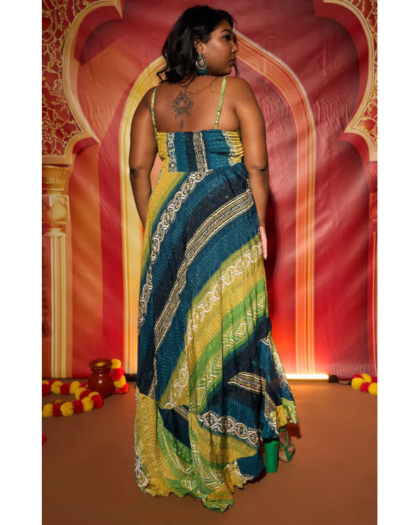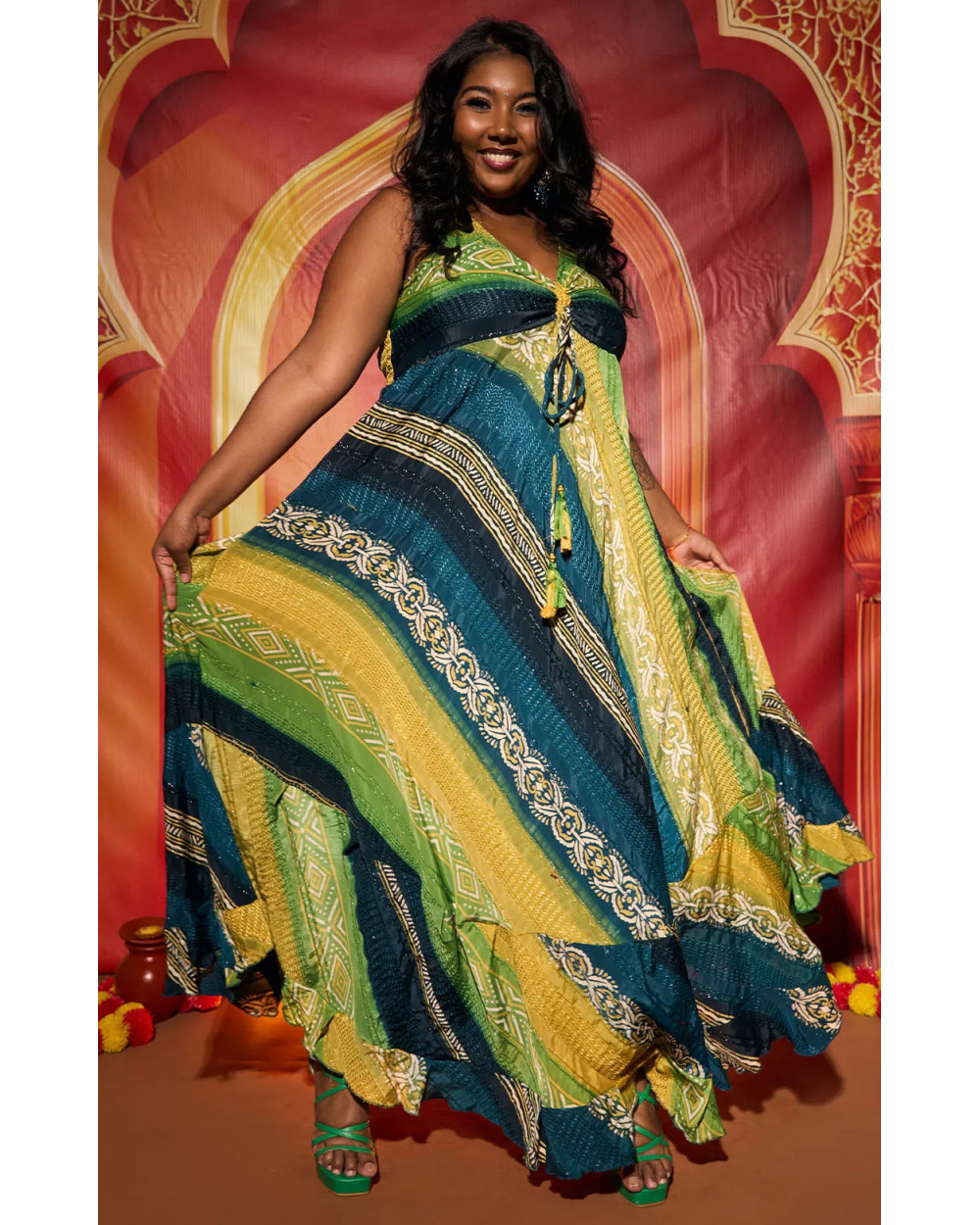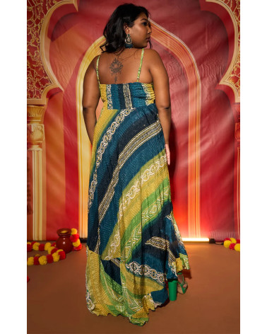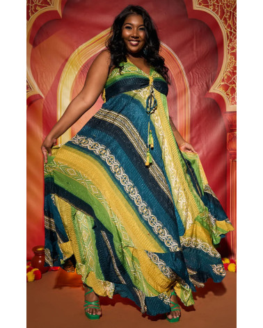 Succombez à l élégance de cette robe longue fluide et ample, inspirée du style indien. Les bretelles fines et le détail de nœud sous la poitrine apportent féminité et charme, tandis que ses couleurs vives et ses motifs sophistiqués créent un look festif et original.