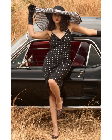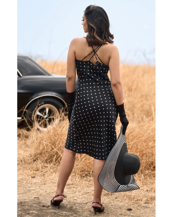 Succombez à l élégance de cette robe à pois, où le décolleté délicatement drapé et le dos croisé apportent finesse et originalité. Fluide et légère, elle accompagne chacun de vos mouvements avec grâce. Déclinée en noir ou écru.