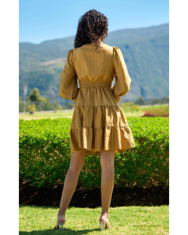 Robe courte à manches longues bouffantes, patineuse et taille ajustée, avec décolleté en V. Disponible en trois coloris, elle permet de créer un look harmonieux avec toute la famille.