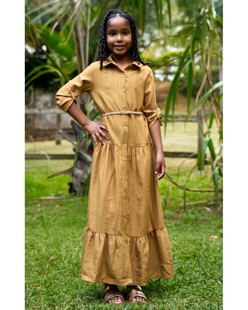 Cette robe longue fillette combine boutons sur le devant, ceinture à la taille et manches mi-longues boutonnables. Confortable et élégante, déclinée en 3 coloris, elle se coordonne parfaitement aux tenues de la famille.