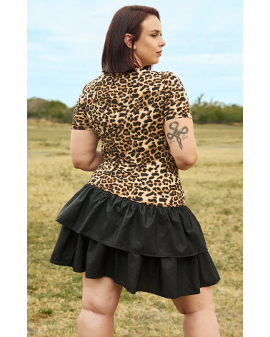 Craquez pour la robe semi léopard mère-fille, à la fois tendance et élégante. Son haut ajusté à la taille, avec manches courtes et col rond, est sublimé par un motif léopard raffiné. La jupe noire bouffante à volants apporte volume et féminité, pour un style unique et moderne.