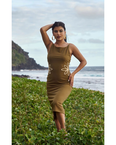 Adoptez un look élégant et léger avec cette robe longue femme. Sa coupe débardeur fluide assure confort et aisance, tandis que deux délicates fleurs inspirées des fleurs du désert décorent les côtés au niveau de la taille.