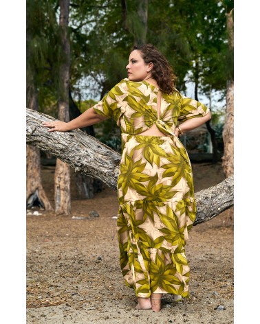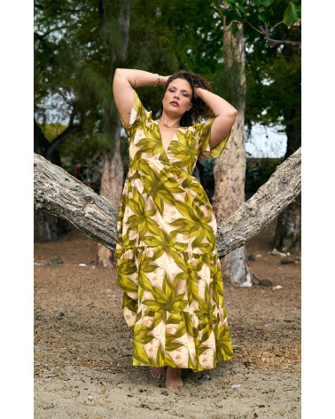 Cette longue robe au haut cache-cœur séduit par ses motifs de feuilles soignés. Disponible en 4 coloris, elle allie confort, fluidité et style pour toutes les occasions.