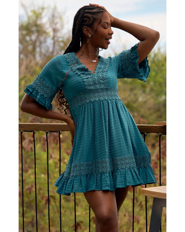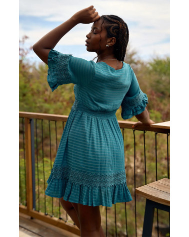 Optez pour une allure bohème avec cette robe courte à manches mi-longues, subtilement ornée de dentelles sur le devant, le bas des manches et le bas de la robe. Disponible en 8 coloris, elle combine charme et confort.