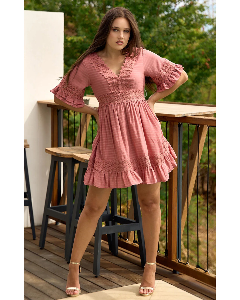 Optez pour une allure bohème avec cette robe courte à manches mi-longues, subtilement ornée de dentelles sur le devant, le bas des manches et le bas de la robe. Disponible en 8 coloris, elle combine charme et confort.