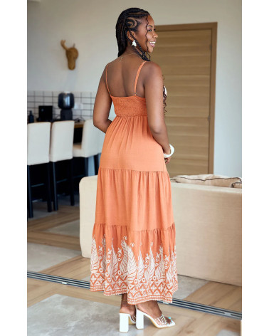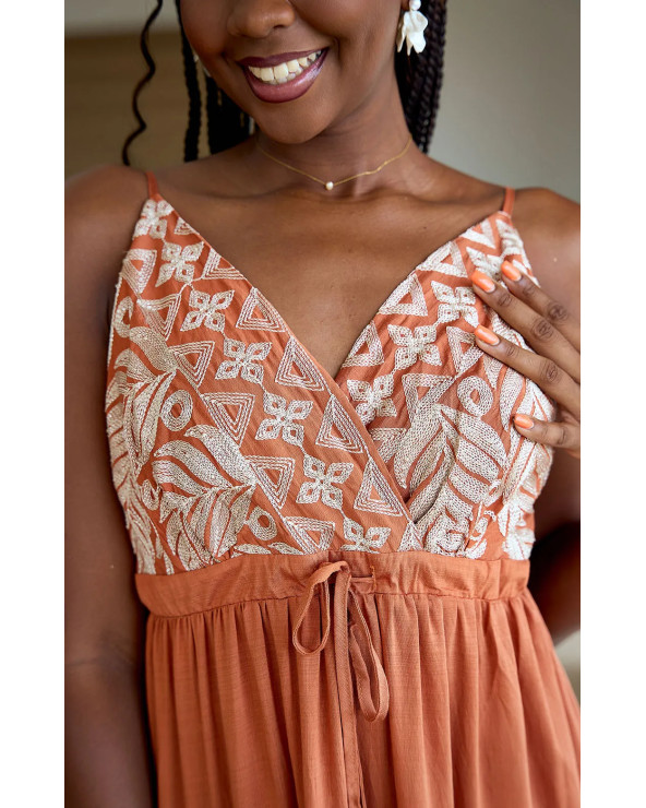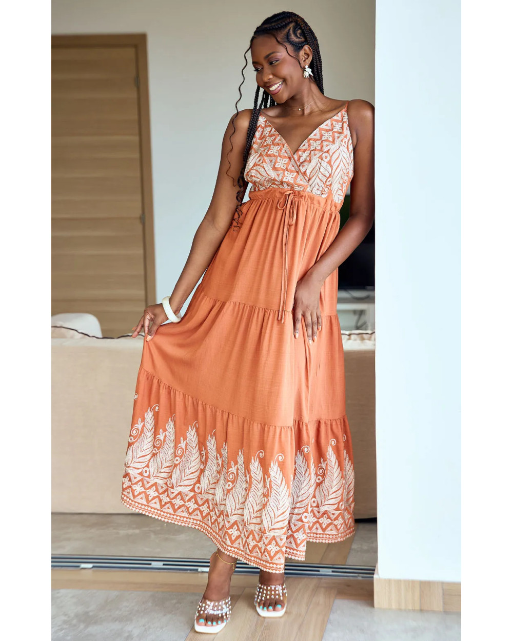 Optez pour cette robe longue à bretelles au cache-cœur flatteur, ponctuée d un nœud à la taille. Ses motifs feuilles et graphiques, répartis sur le haut et le bas, créent un équilibre parfait entre élégance et originalité. Parfaite pour un look mère et fille coordonné.