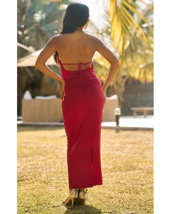 Cette robe met en valeur la silhouette grâce à sa coupe ajustée, tandis que le décolleté drapé noué de ficelles apporte une touche élégante et raffinée. Idéale pour briller lors des événements.