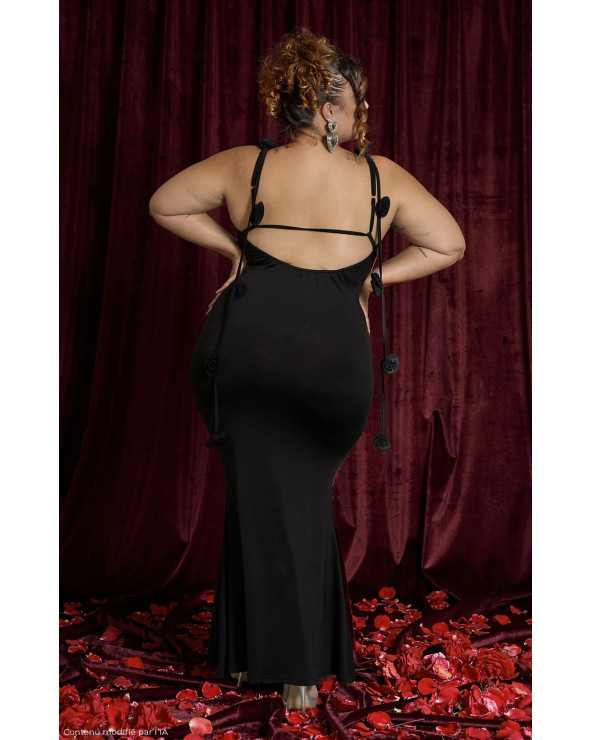 Robe longue à bretelles, sublimée par des fleurs flottantes sur les côtés. Une pièce féminine et raffinée.